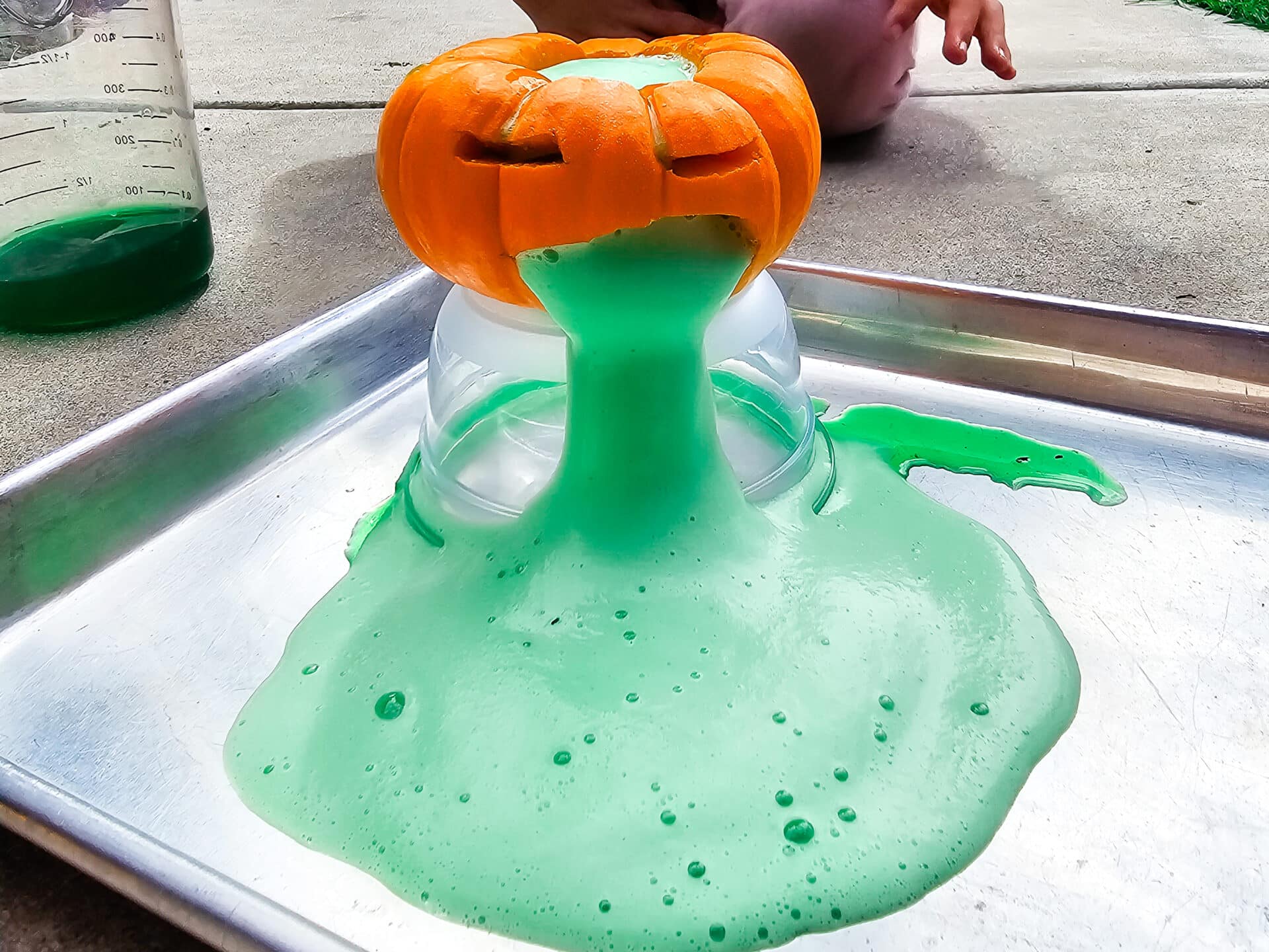Note: if possible, I suggest making your Mini Pumpkin Volcano outside (or in a bathtub LOL), especially if you have an easily excitable kid. Mine generally ends up with her hands and feet in the experiment. Setting it up somewhere they can get messy allows them to really have fun with it.